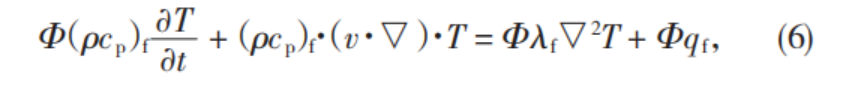 式(6)—式(7)中,ρ為密度,kg/m3;cp為比熱容,J(/kg·K);(ρcp)f為多孔介質(zhì)流相中總的體積比熱容,J/m3;T為溫度,K;t為時(shí)間,s;λf為液體導(dǎo)熱系數(shù),W(/m·K);qf為液體內(nèi)熱源強(qiáng)度,W;(ρcp)s為多孔介質(zhì)固相中總的體積比熱容,J/m3。將式(6)與式(7)相加,可導(dǎo)出單相流體的多孔介質(zhì)的能量方程為: