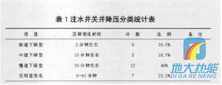 為確定合理降壓時間,在我隊(duì)30口注水井洗井過程中觀察注水井壓力隨關(guān)井時間的變化,以短時間(60分鐘)壓力出現(xiàn)直線段或相對直線段統(tǒng)計(jì),歸納總結(jié)如表1所示的幾種類型:快速下降型、中速下降型、慢速下降型、無明顯變化型。 根據(jù)調(diào)查統(tǒng)計(jì)結(jié)果,來確定不同類型的關(guān)井降壓時間:快速下降型的井只需關(guān)井3 ̄5分鐘;中速下降型的注水井需關(guān)井10 ̄15分鐘;慢速下降型的注水井需關(guān)井降壓30分鐘,無明顯變化型的注水井可直接洗井(洗井時應(yīng)觀察壓降的變化)。為此關(guān)井降壓的最佳時間應(yīng)該是壓降變化趨于穩(wěn)定的時間,較為合理。