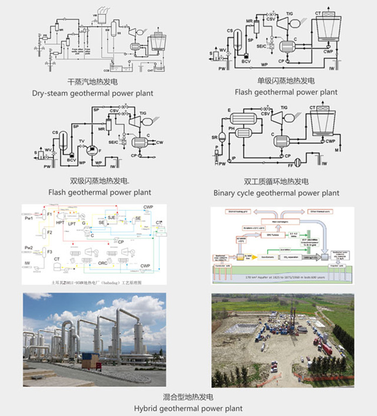 地?zé)岚l(fā)電需根據(jù)地熱流體的溫度、壓力以及它們的水、汽品質(zhì)的不同而采取不同的設(shè)計(jì)方案。其主要類型包括:干蒸汽地?zé)岚l(fā)電、單級閃蒸地?zé)岚l(fā)電、雙級閃蒸地?zé)岚l(fā)電、一井一站地?zé)岚l(fā)電、混合型地?zé)岚l(fā)電、雙工質(zhì)循環(huán)地?zé)岚l(fā)電、干熱巖發(fā)電。