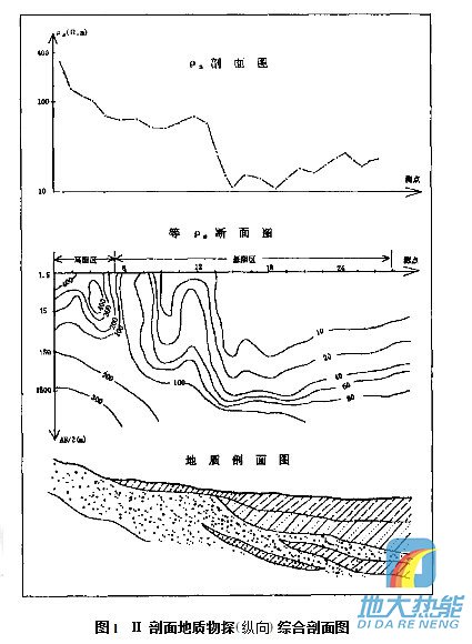 圖1 Ⅱ剖面地質(zhì)物探(縱向)綜合剖面圖 物探電測(cè)深成果和鉆井資料表明,本區(qū)第三系中有三個(gè)含水段,分別在距地表50~70m、100~140m、170~200m處,每段有1~4個(gè)含水層,單層厚度2~26m。富水程度較好,在11眼成井中,單井單位涌水量最大可達(dá)60t/h。