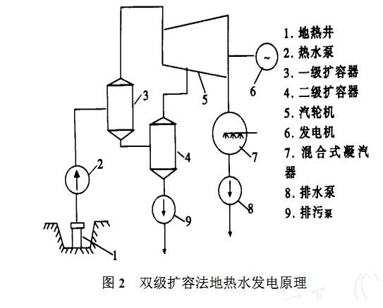 西南電力設(shè)計院設(shè)計的羊八井地?zé)?/a>電站第1臺試驗機組,容量為1000kW,汽輪機是利用四川內(nèi)江電廠2500kW廢棄設(shè)備改造而成。于1977年10月試運成功,采用單級擴容法熱力系統(tǒng)。若把地?zé)崴?/a>送入1個密閉的容器中降壓、擴容,根據(jù)水沸點與壓力的關(guān)系,可使溫度不太高的地?zé)?/a>水因氣壓降低而沸騰變成蒸汽。由于地?zé)?/a>水降壓蒸發(fā)的速度很快,是一種閃急蒸發(fā)過程;同時,地?zé)崴?/a>蒸發(fā)產(chǎn)生蒸汽時,其體積迅速擴大,所以該容器稱為“擴容器”或“閃蒸器”。用這種方法產(chǎn)生蒸汽來發(fā)電稱為擴容法地?zé)崴?/a>發(fā)電。這是利用地?zé)崽?/a>熱水發(fā)電的主要方式之一,該方式分單級擴容法系統(tǒng)和雙級(或多級)擴容法系統(tǒng)。擴容法系統(tǒng)的原理是:將地?zé)峋?/a>來的中溫地?zé)?/a>汽、水混合物,先送到擴容器中進行降壓、擴容(稱閃蒸),使其產(chǎn)生部分蒸汽,蒸汽經(jīng)過分離器除去雜質(zhì)(10μm及以上)后,再引到常規(guī)汽輪機機發(fā)電。