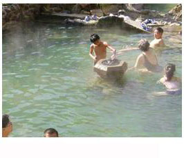 云南巴臘掌溫泉風景在諸泉中,最有特點和傳奇色彩的要數(shù)“仙人澡塘”。在一塊高出河面約25米的巖石上,共有3潭泉水:大的面積約為4平方米, 小的面積分別為0.4和0.5平方米,相隔僅20厘米,卻一冷一熱, 熱的溫度高達95攝氏度,冷的只有20攝氏度。